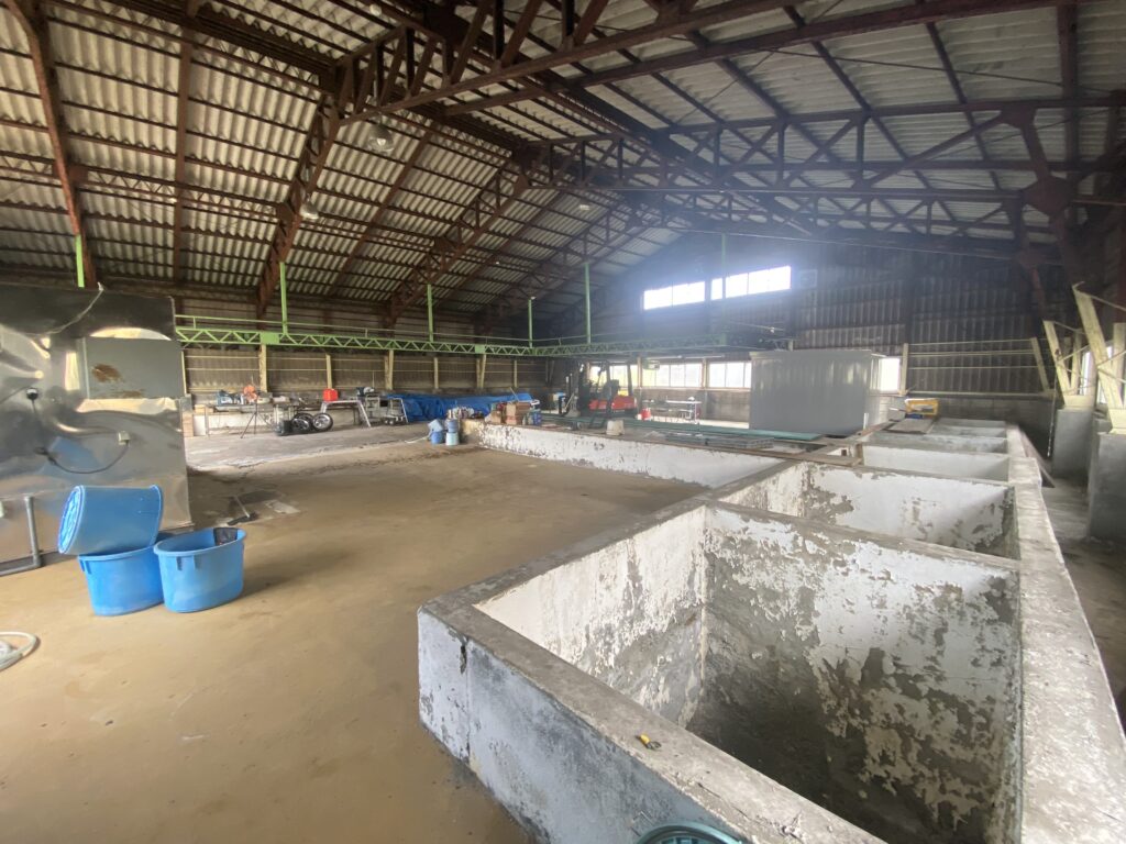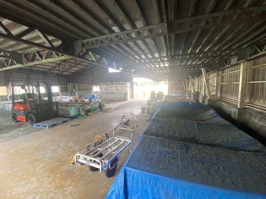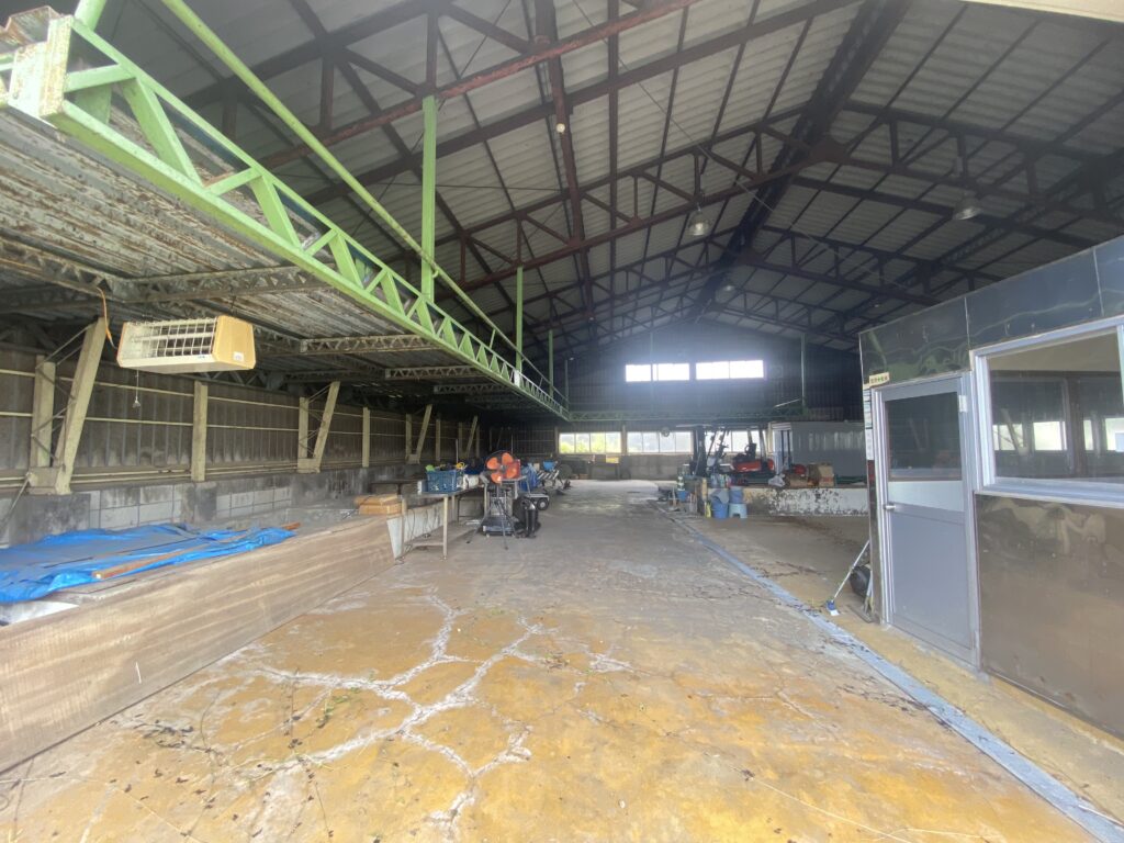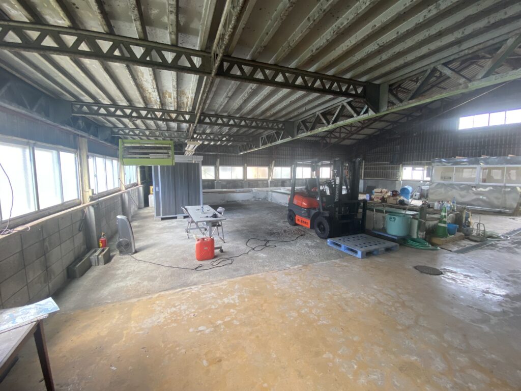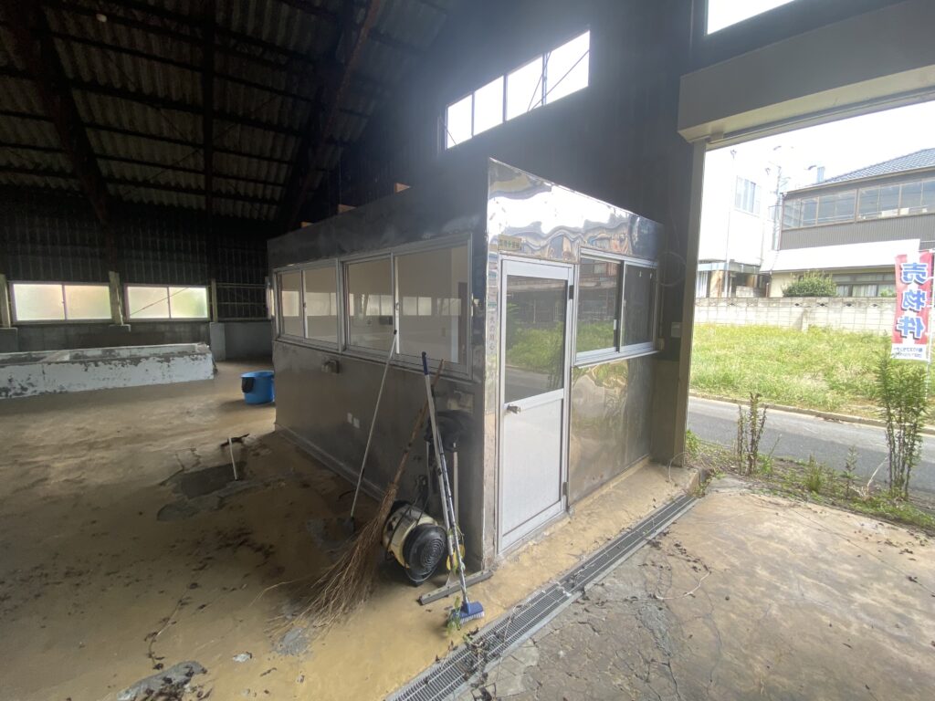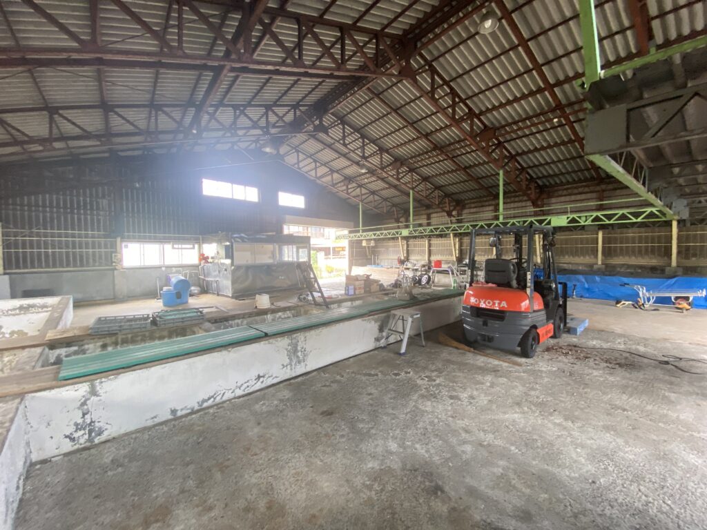 桐生市三吉町、元漬物工場。床に複数の槽あり。電動シャッター・休憩室付き。用途に応じた改装もご相談可能です。